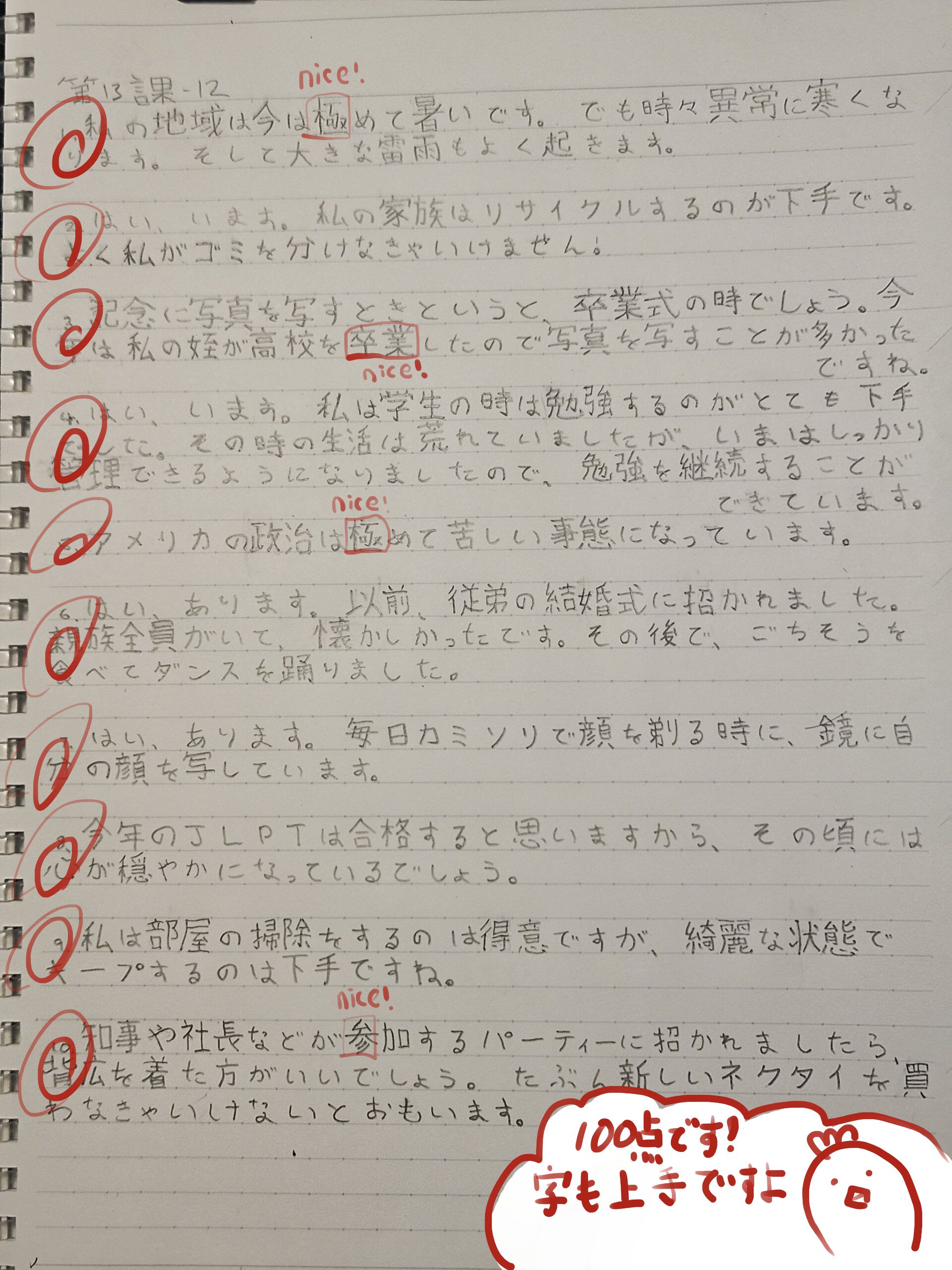 Hitomi Meyer Profile Topics Started Replies Created Engagements Favorites Search replies: Forum Replies Created Log In Register Lost Password Viewing 15 posts - 1 through 15 (of 1,073 total) 1 2 3 … 70 71 72 → Author Posts October 1, 2025 at 10:50 pm in reply to: 中級の日本語 (第13課-13) #4604 Hitomi MeyerKeymaster Replies viewable by members only Attachments: Jim-san-第13課-13.mp3 October 1, 2025 at 9:37 pm in reply to: 中級の日本語 (第13課-14) #4599 Hitomi MeyerKeymaster Replies viewable by members only This reply was modified 4 days, 8 hours ago by Hitomi Meyer. This reply was modified 4 days, 8 hours ago by Hitomi Meyer. This reply was modified 4 days, 8 hours ago by Hitomi Meyer. September 29, 2025 at 7:16 am in reply to: 中級の日本語 (第13課-13) Handwriting Homework #4594 Hitomi MeyerKeymaster Replies viewable by members only September 28, 2025 at 12:41 am in reply to: 中級の日本語 (第13課-13) Handwriting Homework #4590 Hitomi MeyerKeymaster Replies viewable by members only Attachments:13-13hw-scaled-1.jpg September 27, 2025 at 10:09 pm in reply to: 中級の日本語 (第13課-13) #4589 Hitomi MeyerKeymaster Replies viewable by members only September 25, 2025 at 8:14 pm in reply to: 中級の日本語 (第13課-13) #4575 Hitomi MeyerKeymaster Replies viewable by members only September 25, 2025 at 7:13 am in reply to: 中級の日本語 (第13課-13) #4573 Hitomi MeyerKeymaster Replies viewable by members only September 25, 2025 at 4:09 am in reply to: 今月の文化 2025年8月 山の日 #4572 Hitomi MeyerKeymaster なるほど。アメリカの山は高い山が多いんですね。それは登るのが大変そうですね。 日本の山は小さい物もありますから登りやすいそうですよ。 September 4, 2025 at 7:30 am in reply to: 中級の日本語 (第13課-13) #4560 Hitomi MeyerKeymaster Replies viewable by members only This reply was modified 1 month ago by Hitomi Meyer. This reply was modified 1 month ago by Hitomi Meyer. September 4, 2025 at 7:28 am in reply to: 中級の日本語 (第13課-12) #4557 Hitomi MeyerKeymaster Replies viewable by members only Attachments: Jim-san-第13課-12.mp3 August 28, 2025 at 8:14 am in reply to: 中級の日本語 (第13課-12) Handwriting Homework #4544 Hitomi MeyerKeymaster Replies viewable by members only Attachments:13-12-scaled-1.jpg August 26, 2025 at 8:23 am in reply to: 今月の文化 2025年7月 そうめん #4541 Hitomi MeyerKeymaster 最近はアメリカも物価が高くて大変そうですね。いつか世界中の人たちがのんびり旅行ができるようになるといいですね。 August 22, 2025 at 8:04 pm in reply to: 中級の日本語 (第13課-12) #4538 Hitomi MeyerKeymaster Replies viewable by members only August 21, 2025 at 7:43 am in reply to: 今月の文化 2025年7月 そうめん #4536 Hitomi MeyerKeymaster 韓国の冷麺もおいしいですね。Hマートで買ったことがあります。 おいしい素麺をアメリカで探すのは難しいかもしれませんよ。日本に来たら是非素麺を食べて見て下さい。 August 21, 2025 at 7:42 am in reply to: 中級の日本語 (第13課-12) #4535 Hitomi MeyerKeymaster Replies viewable by members only Author Posts Log In Register Lost Password Viewing 15 posts - 1 through 15 (of 1,073 total) 1 2 3 … 70 71 72 →
